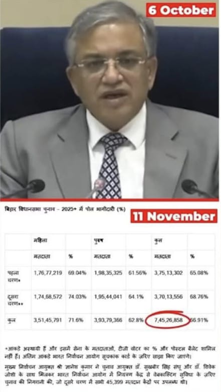 आप ही बताएं, ये चुनाव आयोग का कैसा गणित है। जिसके मुताबिक 7.42 करोड़ का 66.9% = 7.45 करोड़ होता है। एक कक्षा 5 का बच्चा भी इसे देख कर हंस देगा।