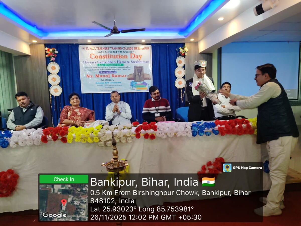 जे टी न्यूज़, समस्तीपुर : सेंट पॉल टीचर्स’ ट्रेनिंग कॉलेज, बीरसिंहपुर में आज संविधान दिवस बड़े ही गरिमामय वातावरण में मनाया गया। ध्यातव्य है कि कॉलेज को नैक द्वारा ग्रेड बी प्लस प्लस से मान्यता प्राप्त है। संविधान के अंगीकृत होने के 75 वर्ष के उपलक्ष्य में आयोजित इस कार्यक्रम का मुख्य विषय “हमारा संविधान, हमारा स्वाभिमान” रहा। कार्यक्रम में मुख्य अतिथि के रूप में जिला विधिक सेवा प्राधिकरण, समस्तीपुर के सचिव श्री मनोज कुमार उपस्थित थे। उनके द्वारा शिक्षा के अधिकार, संविधान की मूल आत्मा, मौलिक अधिकारों एवं कर्तव्यों की भूमिका, तथा नागरिकों की संवैधानिक जिम्मेदारियों पर विशेष व्याख्यान प्रस्तुत किया गया। श्री कुमार ने विद्यार्थियों को संबोधित करते हुए कहा कि भारतीय संविधान न केवल विश्व के सबसे बड़े लोकतंत्र का मार्गदर्शक दस्तावेज है, बल्कि यह प्रत्येक नागरिक की गरिमा, समानता और न्याय की सुनिश्चितता का संवाहक भी है।