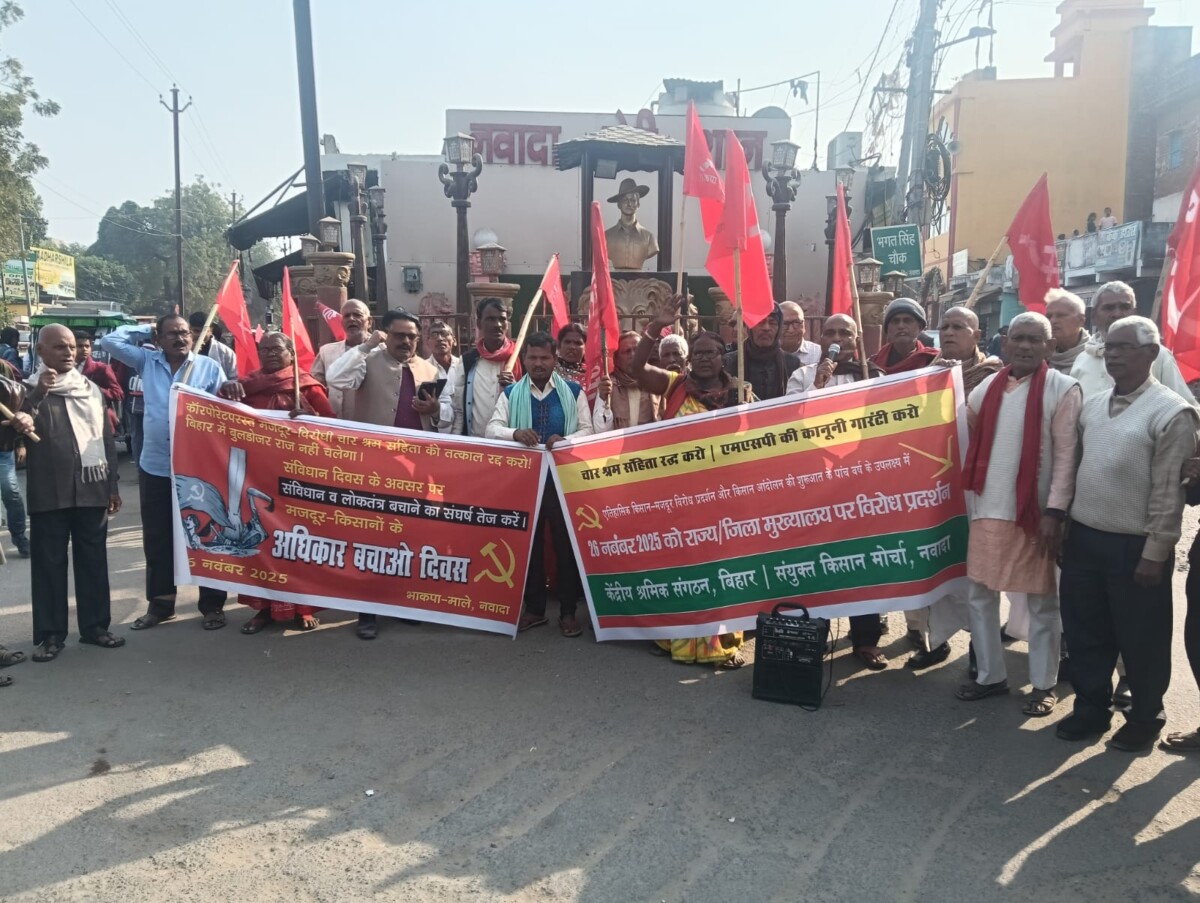 जे टी न्यूज, नवादा :केंद्रीय श्रम संगठनों एवं संयुक्त किसान मोर्चा के राष्ट्रव्यापी पर नगर थाना के समीप से विरोध मार्च विरोध मार्च निकाला गया जो भगत सिंह चौक पर सभा में तब्दील हो गया , ओर जमकर नारे लगाए जो क्रमशः गुलामी के चार श्रम संहिता रद्द करो, एस पी को कानूनी दर्जा दो, बिहार में बुलडोजर राज बंद करो , सांप्रदायिक फासीवादी मुर्दाबाद आदि।