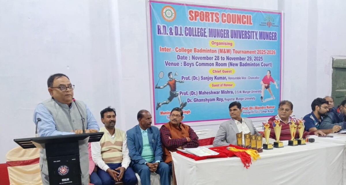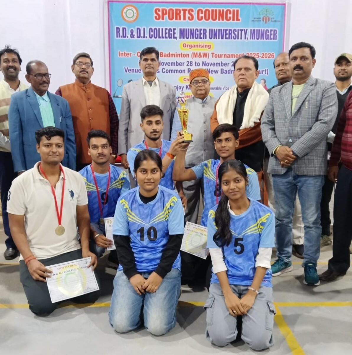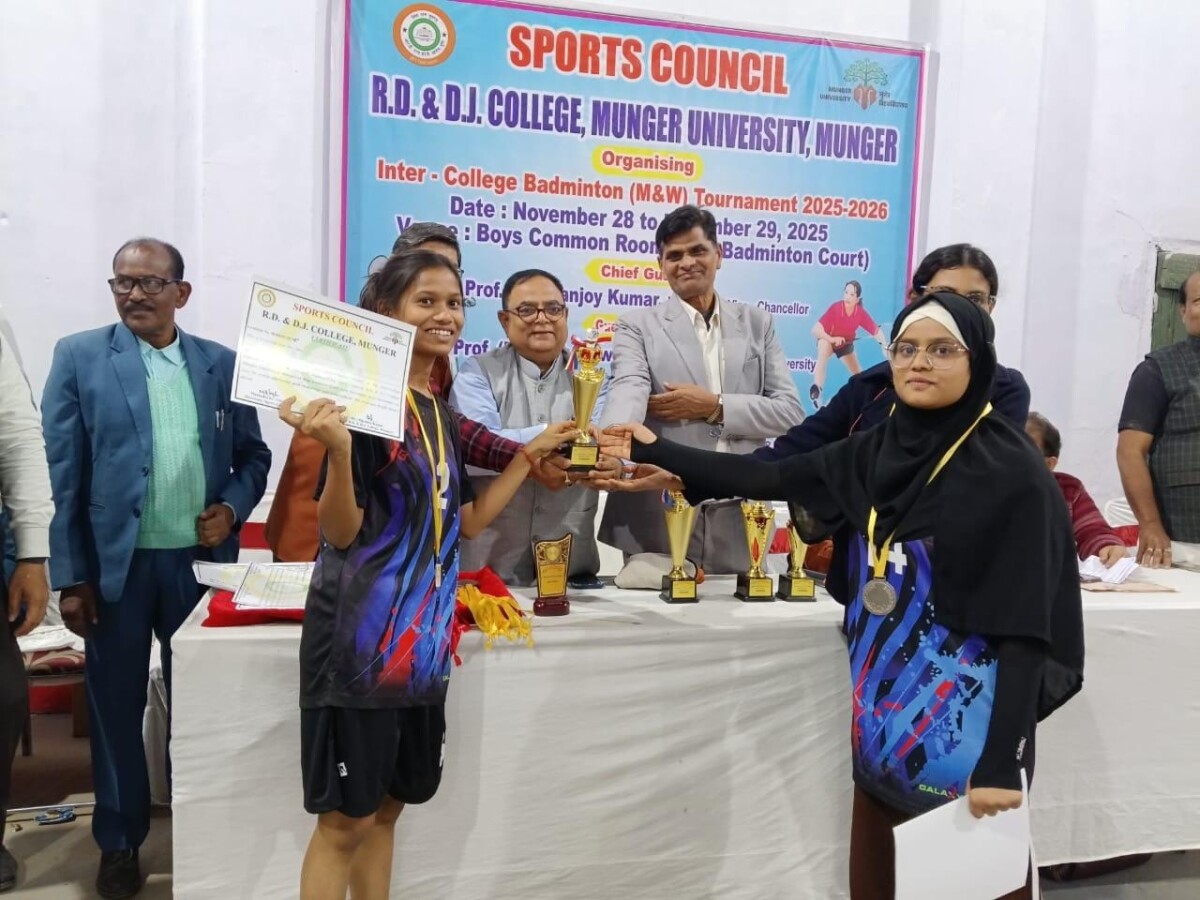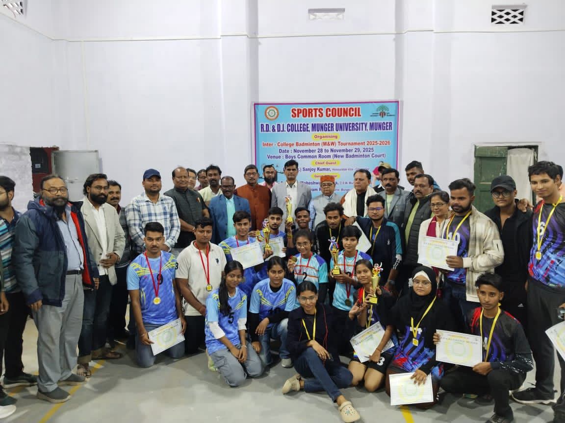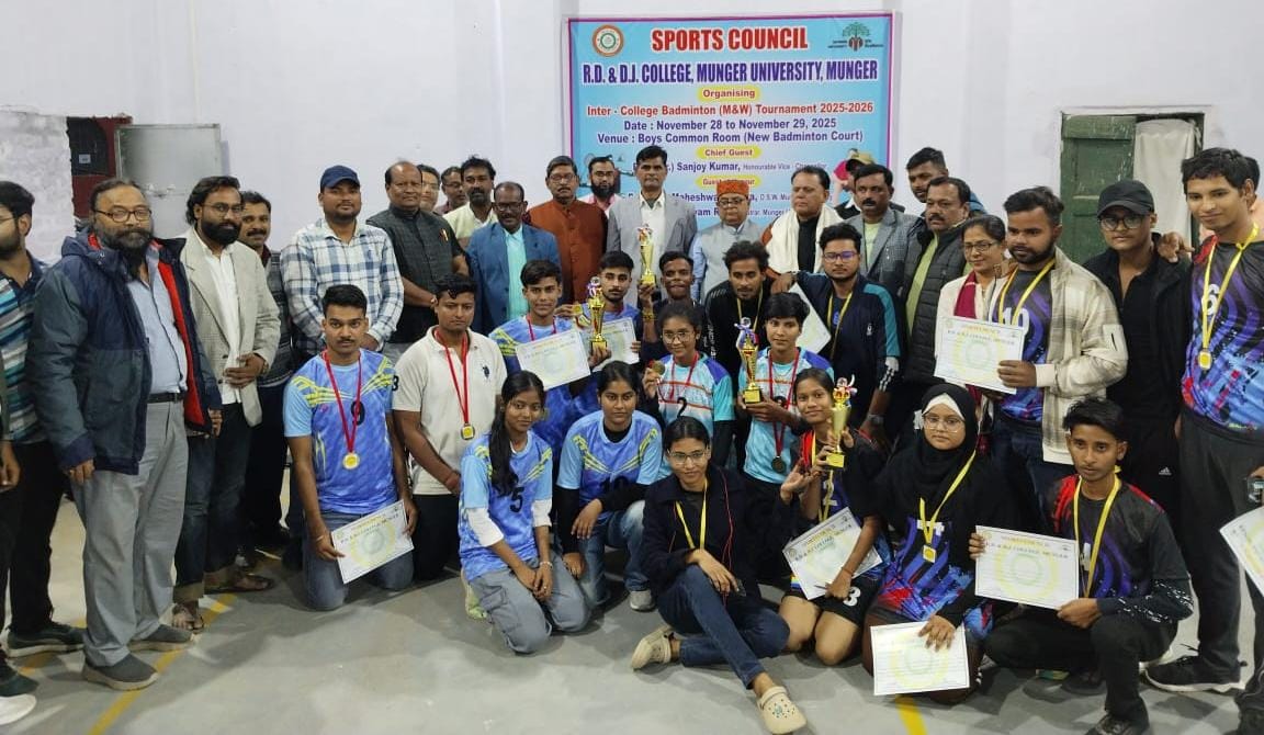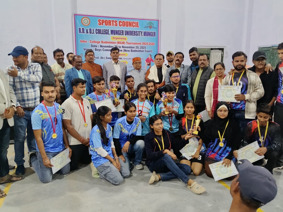 मुंगेर विश्वविद्यालय, मुंगेर के खेल कैलेंडर 2025-2026 के अनुसार आरडी एंड डीजे कॉलेज के बॉयज कॉमन रूम में आज दो दिवसीय इंटर कॉलेज बैडमिंटन टूर्नामेंट का समापन हो गया। यह ज्ञातव्य है कि इंटर कॉलेज बैडमिंटन टूर्नामेंट का आयोजन नवंबर 28 से नवंबर 29 को किया जा रहा है। इस टूर्नामेंट में मुख्य अतिथि के रूप में मुंगेर विश्वविद्यालय के माननीय कुलपति प्रो डॉ संजय कुमार, विशिष्ट अतिथि के रूप में डीएसडब्ल्यू प्रो डॉ महेश्वर मिश्रा, कुलसचिव डॉ घनश्याम राय, आरडी एंड डीजे कॉलेज के प्रधानाचार्य प्रो डॉ बिजेंद्र कुमार, डीएसएम कॉलेज झाझा के प्राचार्य डॉ अजफर शम्शी, मुंगेर विश्वविद्यालय के क्रीड़ा सचिव डॉ संजय मांझी, डिप्टी रजिस्ट्रार डॉ अंशु राय ,डॉ प्रियरंजन तिवारी मौजूद रहे। आरडी एंड डीजे कॉलेज के क्रीडा सचिव मुनींद्र कुमार सिंह ने बताया कि इस टूर्नामेंट में कुल 10 टीम ने प्रतिभाग किया जिसमें महिला की चार टीम और पुरुष के 6 टीम शामिल है। पुरुष वर्ग में इंटर कॉलेज बैडमिंटन टूर्नामेंट का विजेता डीएसएम कॉलेज झाझा रहा जबकि उपविजेता आरडी एंड डीजे कॉलेज रहा। महिला वर्ग में इंटर कॉलेज बैडमिंटन टूर्नामेंट का विजेता जेआरएस कॉलेज रहा जबकि उपविजेता आरडी एंड डीजे कॉलेज रहा।