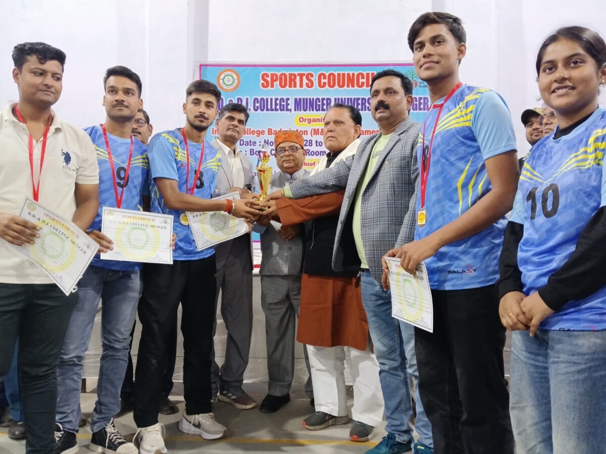 आरडी एंड डीजे कॉलेज के प्राचार्य प्रो डॉ बिजेंद्र कुमार ने कहा कि कॉलेज के क्रीडा परिषद के सभी सदस्यों को पारदर्शी और ऐतिहासिक आयोजन के बधाई दिया। उन्होंने कॉलेज का स्पोर्ट्स कैलेंडर को नियमित करने के लिए दिशा निर्देश दिए। मुंगेर विश्वविद्यालय के डीएसडब्ल्यू प्रो डॉ महेश्वरी मिश्र टूर्नामेंट में छात्रों की सहभागिता में संवर्धन के लिए प्रेरित किया।मुंगेर विश्वविद्यालय के कुलसचिव डॉ घनश्याम राय ने कहा कि अगले वर्ष से सभी कॉलेजों को टूर्नामेंट में प्रतिभाग करना अनिवार्य होगा इसके लिए मुंगेर विश्वविद्यालय प्रभावी ढंग से प्रयासरत रहेगा। सभी विजेता प्रतिभागियों को मेडल एवं प्रशस्ति पत्र प्रदान किया गया एवं चैंपियनशिप शील्ड भी प्रदान किया गया। इस कार्यक्रम को सफल बनाने सौरव कुमार, राजीव रंजन, प्रशांत कुमार, अकांश, आलोक, विकास की अहम भूमिका रही। पुरस्कार वितरण के दौरान विभिन्न कॉलेजों के क्रीड़ा सचिव, टीम मैनेजर ,कोच, मुंगेर विश्वविद्यालय के पूर्व प्रॉक्टर संजय कुमार, कॉलेज इंस्पेक्टर कलाल बाखला, डॉ शाहिद राजा जमाल, डॉ अनीश अहमद ,डॉ प्रभाकर पोद्दारआदि मौजूद रहे। इस टूर्नामेंट के के रेफरी मुंगेर बैडमिंटन एसोसिएशन के सचिव श्री बिरेंद्र भारती है , रेफरी गौरव कुमार ,अनमोल वर्मा को भी सम्मानित किया गया। मुंगेर विश्वविद्यालय के पुरुष बैडमिंटन टीम और महिला बैडमिंटन टीम के चयनित खिलाड़ियों की सूची कल जारी की जाएगी।