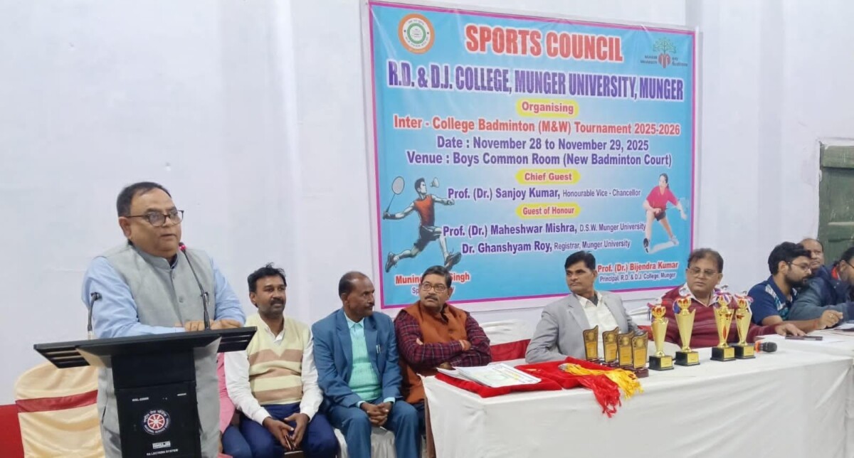 मुंगेर विश्वविद्यालय के स्पोर्ट्स कैलेंडर 2025-26 के तहत आरडी एंड डीजे कॉलेज परिसर में 28–29 नवंबर को आयोजित इंटर कॉलेज बैडमिंटन टूर्नामेंट का परदा सफलतापूर्वक गिर गया। कॉलेज के प्राचार्य प्रो. (डॉ.) बिजेंद्र कुमार के निर्देशन में नवनिर्मित बॉयज कॉमन रूम बैडमिंटन कोर्ट पर हुए इस दो दिवसीय मुकाबले ने खिलाड़ियों की दमदार प्रतिभा को जमकर परखा।