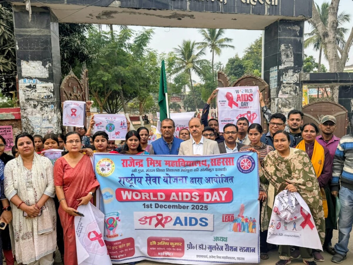 विश्व एड्स दिवस 2025 के मौके पर राजेन्द्र मिश्र महाविद्यालय, सहरसा में राष्ट्रीय सेवा योजना (NSS) के तत्वावधान में एक महत्वपूर्ण संगोष्ठी आयोजित की गई। इसके उपरांत प्राचार्य प्रो. (डॉ.) गुलरेज रौशन रहमान ने तिवारी टोला बायपास रोड पर जागरूकता रैली को हरी झंडी दिखाकर रवाना किया।