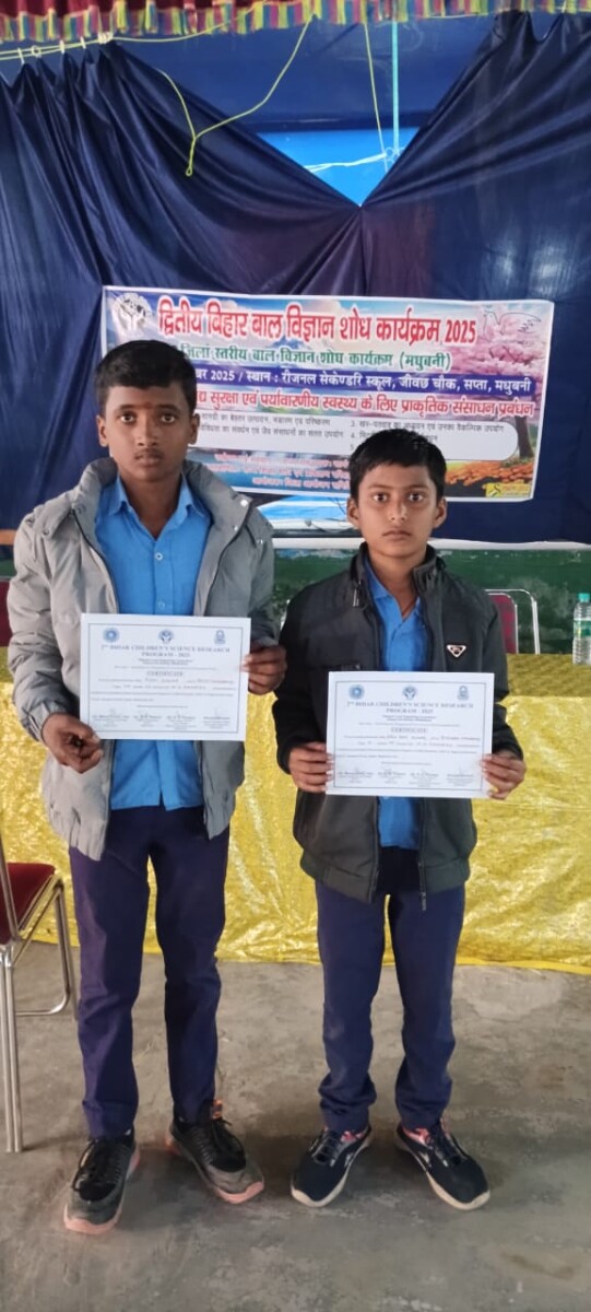 जे टी न्यूज, मधुबनी : लदनियां प्रखंड के महथा गांव स्थित उत्कृष्ट मध्यविद्यालय के दो प्रतिभागी छात्रों का चयन मधुबनी स्थित रीजनल सेकेंडरी स्कूल में सोमवार को आयोजित द्वितीय जिला स्तरीय बाल विज्ञान शोध कार्यक्रम में किया गया। छात्र देव राज कुमार व ऋषि कुमार का चयन अपने प्रोजेक्ट आधुनिक एग्रीकल्यर मैथडके लिए किया गया है। ये छात्र अब इसी महीने की तारीख 20 व 21 दिसंबर को मधुबनी में ही आयोजित होने वाले राज्य स्तरीय बाल विज्ञान शोध कार्यक्रम में भाग लेंगे। क्रमश: वर्ग सप्तम व अष्टम में अध्ययनरत इन चयनित छात्रों को डीपीओ मणिभूषण प्रसाद ने प्रशस्तिपत्र देकर सम्मानित किया। मौके पर छात्र के गाइड एचएम प्रेमनाथ गोसाई, शिक्षक जीबछ कामत व भोगेन्द्र सिंह भी उपस्थित थे। बीडीओ राकेश कुमार ठाकुर व बीईओ अमितेश कुमार ने छात्र की इस सफलता पर छात्र व विद्यालय परिवार के प्रति धन्यवाद ज्ञापित किया है।