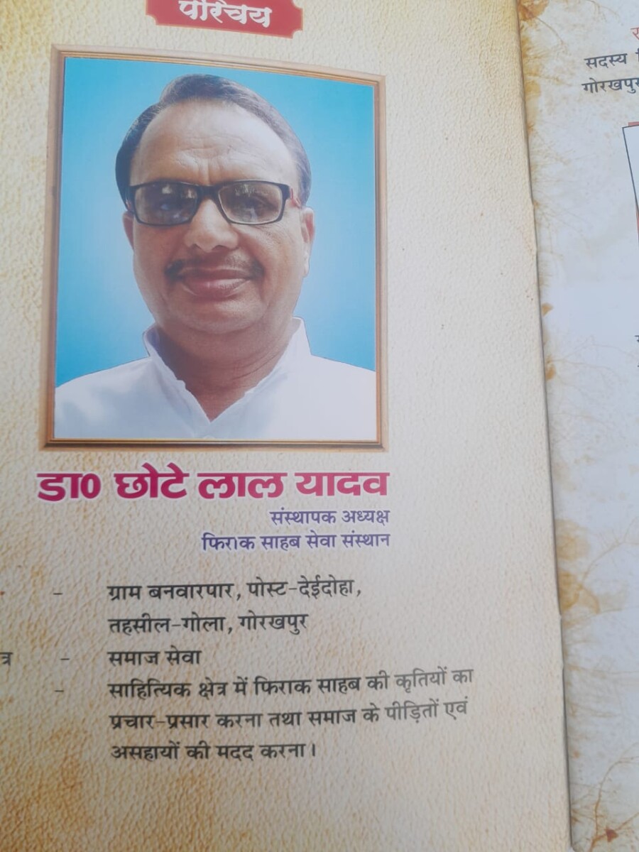 गोरखपुर जिले की गोला तहसील के बनवरपार ग्राम निवासी डॉ. छोटेलाल यादव ‘प्रचण्ड’ विगत 35 वर्षों से महान शायर रघुपति सहाय ‘फ़िराक़ गोरखपुरी’ की साहित्यिक विरासत को सहेजने और समाजसेवा में समर्पित हैं। अपने न सिर्फ प्रादेशिक स्तर पर बल्कि भारत सरकार को इसके लिए ध्यान आकर्षित करने की कोशिश की और योगी आदित्यनाथ जी की कृपा से दिल्ली से एक बस की यात्रा शुरुआत हुई है जिसका नाम फिराक गोरखपुरी के नाम पर रखा गया फिराक गोरखपुरी की स्मृति में यह बड़ी उपलब्धि है आपको बताते चलें छोटे लाल यादव 35 सालों से समर्पितहैं स्नातक शिक्षा प्राप्त डॉ. यादव ‘फ़िराक़ साहब सेवा संस्थान’ के संस्थापक/अध्यक्ष हैं, जिसके माध्यम से वे फ़िराक़ साहब की जन्मस्थली को एक साहित्यिक और पर्यटन केंद्र के रूप में विकसित करने के लिए निरंतर प्रयास कर रहे हैं।