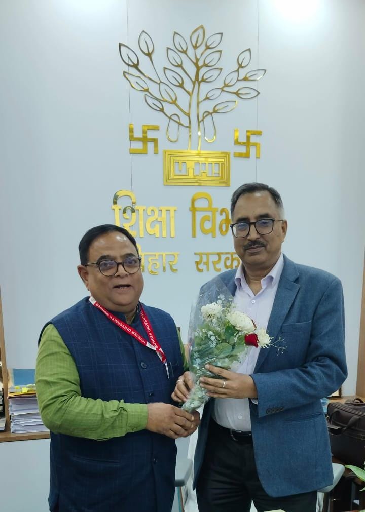 सोमवार को डॉ. घनश्याम राय, कुलसचिव, मुंगेर विश्वविद्यालय ने बिहार सरकार के उच्च शिक्षा विभाग के निदेशक प्रोफेसर एन.के. अग्रवाल से पटना स्थित विकास भवन में उनके कार्यालय कक्ष में शिष्टाचार भेंट की। इस अवसर पर डॉ. राय ने प्रो. अग्रवाल को पुष्पगुच्छ भेंट कर सम्मानित किया।