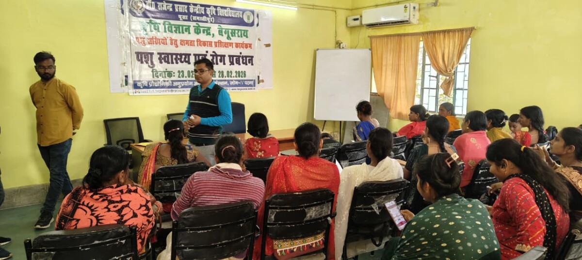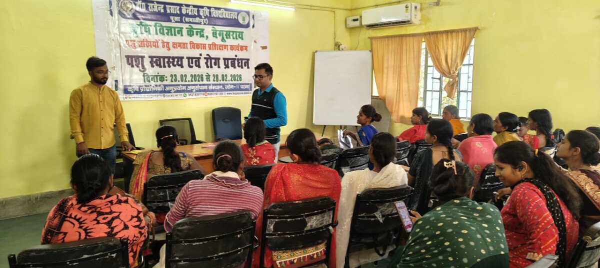 डॉ. राजेंद्र प्रसाद केंद्रीय कृषि विश्वविद्यालय (समस्तीपुर) के अंतर्गत कृषि विज्ञान केंद्र, खोड़ावनपुर में आयोजित “पशु स्वास्थ्य एवं रोग प्रबंधन” प्रशिक्षण कार्यक्रम (23 फरवरी 2026 से 28 फरवरी 2026) का दूसरा दिन उत्साहपूर्वक संपन्न हुआ। कार्यक्रम का उद्देश्य पशु सखियों एवं ग्रामीण पशुपालकों को वैज्ञानिक जानकारी देकर पशुधन की उत्पादकता बढ़ाना है।