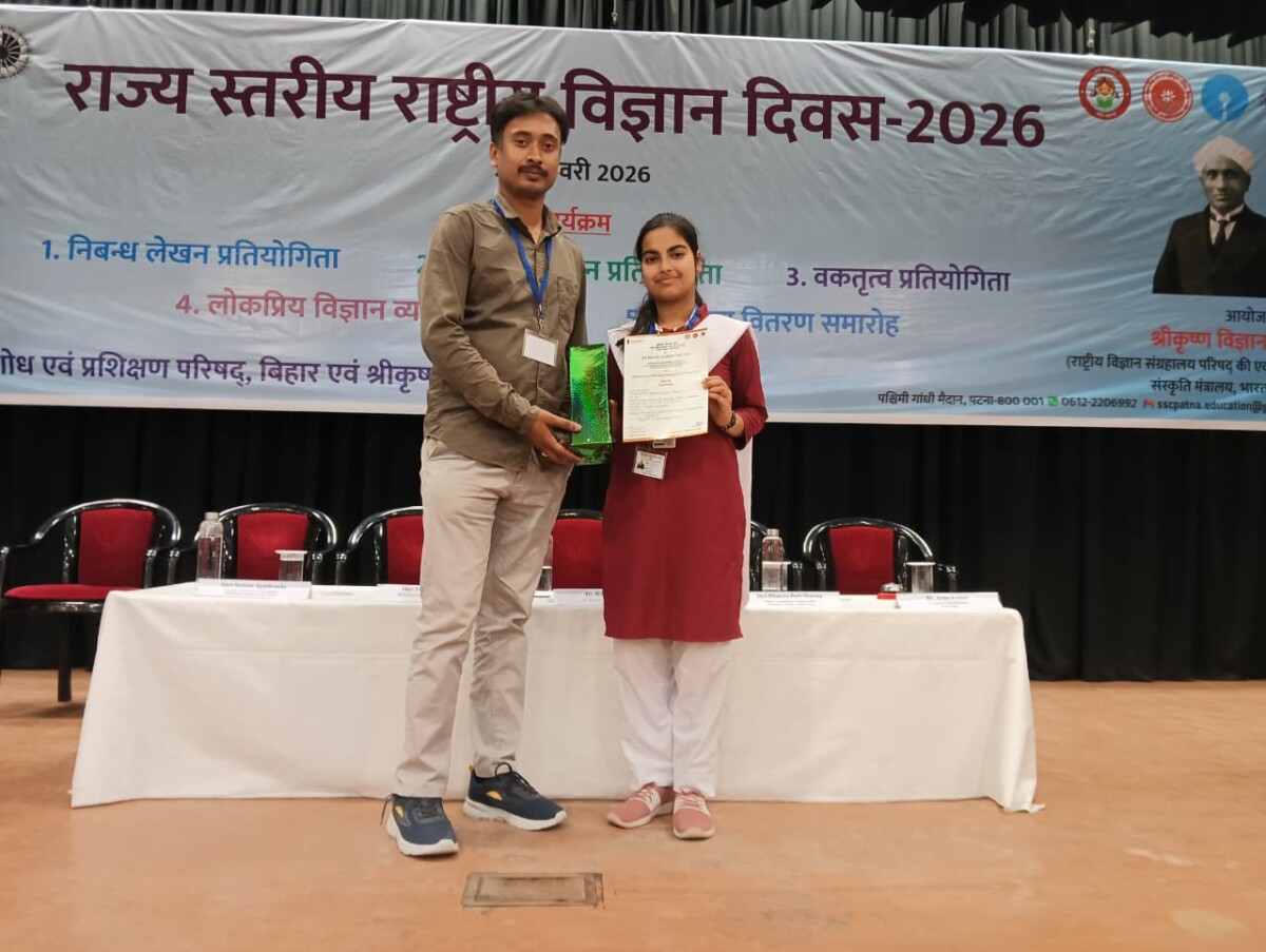 जे टी न्यूज,मधुबनी : बीते शनिवार को विज्ञान दिवस के अवसर पर पटना में आयोजित राज्यस्तरीय विज्ञान प्रतियोगिता में वक्तृता विधा में राज्य स्तर पर तृतीय स्थान प्राप्त कर साक्षी ने पूरे दरभंगा प्रमंडल एवम मधुबनी जिले का नाम रौशन किया है। जिले के कलुआही प्रखंड के उत्क्रमित उच्च माध्यमिक विद्यालय बेलाही के शिक्षक गौतम कुमार के मार्गदर्शन में साक्षी ने यह सफलता प्राप्त की है। विज्ञान दिवस पर पटना में आयोजित कार्यक्रम का उद्घाटन बिहार के उप मुख्यमंत्री सम्राट चौधरी जी द्वारा किया गया। प्रधानाध्यापक शिव कुमार झा सहित पूरा विद्यालय परिवार साक्षी की इस सफलता पर गौरवान्वित है।