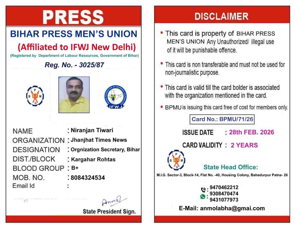 जे टी न्यूज, पटना: बिहार का एकमात्र श्रम संसाधन विभाग बिहार सरकार से पंजीकृत इंडियन फेडरेसन ऑफ वर्किंग जर्नलिस्ट(आई एफ डब्ल्यू) से संबद्ध बिहार प्रेस मेंस यूनियन मे निरंजन तिवारी को प्रदेश संगठन सचिव बनाया गया है। ज्ञात हो कि पत्रकारिता के प्रति समर्पण कर्मठता ईमानदारी और आत्म निष्ठा को देखते हुए प्रदेश अध्यक्ष अनमोल कुमार ने उन्हें बिहार प्रेस मेंस यूनियन का प्रदेश संगठन सचिव मनोनीत किया है। पत्रकार हित में सतत संघर्षरत और आवाज बुलंद करने वाले यूनियन के संस्थापक अध्यक्ष एसएन श्याम सचिव संजय तिवारी अवधेश कुमार शर्मा और राजन तिवारी ने स्वागत करते हुए प्रदेश अध्यक्ष को शुभकामनाएं और निरंजन तिवारी को ढे़र सारी बधाइयां दी हैं।