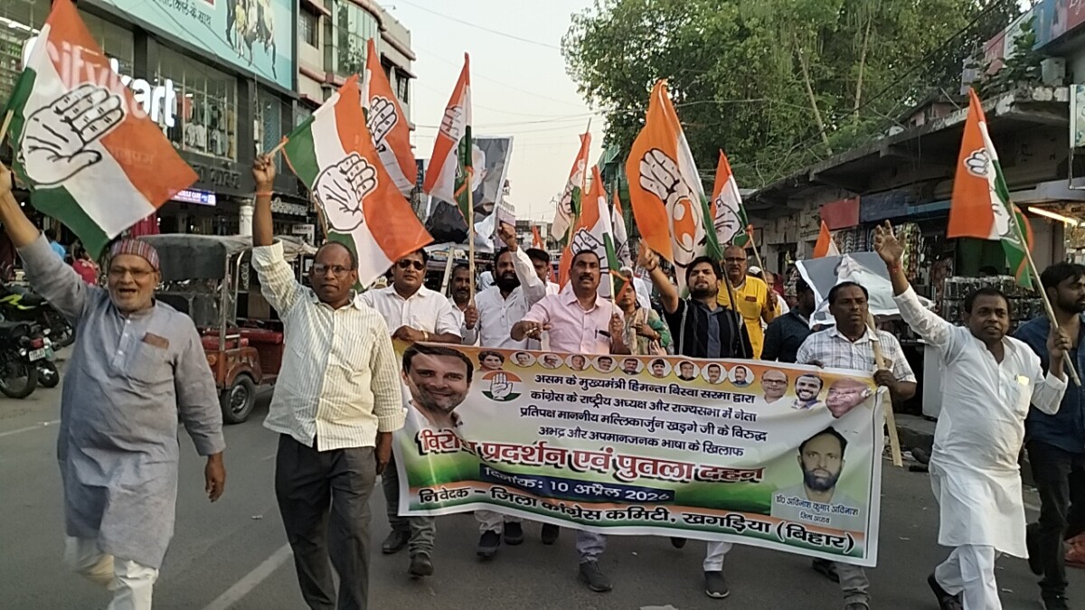 इसी अपमान के खिलाफ बिहार प्रदेश कांग्रेस कमिटी के आह्वान पर राज्यव्यापी विरोध प्रदर्शन के तहत आज खगड़िया में भी कांग्रेस द्वारा जबरदस्त विरोध प्रदर्शन किया गयाl उन्होंने कहा कि आज देश गंभीर दौर से गुजर रहा है,भाजपा सरकार नफरत की राजनीति के सहारे देश पर काबिज है,देश में महंगाई,भ्रष्टाचार,बेरोजगारी चरम पर है,असम के मुख्यमंत्री के गैरजिम्मेदारा बयान कि मैं घोर निंदा करता हूं और असम के मुख्यमंत्री हेमंत बिस्वा सरमा से इस्तीफे की मांग करता हूं और केंद्र की मोदी सरकार के खिलाफ आंदोलन और तेज करने का आह्वान करता हूं उक्त मौके पर पूर्व जिला अध्यक्ष कुमार भानु प्रताप उर्फ गुड्डु पासवान, कार्यकारी जिला अध्यक्ष राजकिरण ठाकुर,पूर्व प्रत्याशी गायत्री भारती,जिला उपाध्यक्ष ख़तिबूर रहमान,सूर्यनारायण वर्मा,मनोज मिश्रा,जिला प्रवक्ता अरुण कुमार अधिवक्ता,प्रदेश डेलिगेट उदय यादव,अर्जुन स्वर्णकार,जिला सचिव राजीव उर्फ गुड्डु,सुभाष रत्न,युवा कांग्रेस जिला अध्यक्ष नवीन यादव,गोगरी प्रखंड अध्यक्ष रविन्द्र चौरसिया,नगर अध्यक्ष रौशन चंद्रवंशी,कार्यालय मंत्री अवनी कुमार,एस सी/एस टी जिला अध्यक्ष पप्पू पासवान,कांग्रेस नेता फूलचंद यादव, विवकानंद शर्मा,विवेकानंद सिंह,विप्लव रणधीर,अर्जुन यादव,वीर प्रकाश यादव,कारेलाल यादव आदि उपस्थित थे l