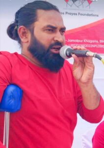 जे टी न्यूज, खगड़िया: गोगरी अनुमंडल स्थित चकयुसुफ मोहल्ला के एक पैर से दिव्यांग आरिफ अराफ़ात अपने जैसे दिव्यांग भाइयों एवं बहनों के लिए मददगार के रूप में पहचान बना चुके हैं। अब आरिफ अराफ़ात किसी परिचय के मोहताज नहीं है। आरिफ जब 2 साल का था तो पोलियो बीमारी के कारण एक पांव से दिव्यांग हो गया ।आरिफ अराफात शारीरिक बाधाओं के बावजूद भी मास्टर ऑफ आर्ट तक की पढ़ाई की है। एवं असिस्टेंट प्रोफेसर के लिए नेट एवं जेआरएफ की तैयारी भी करते हैं। आरिफ दिव्यांग एक्टिविस्ट के रूप में पहचान बनाने के अलावा अभी वर्तमान में दूरस्थ शिक्षा के माध्यम से वकालत की पढ़ाई भी आगरा से कर रहे हैं जिससे कि दिव्यांग जनों को संवैधानिक एवं कानूनी अधिकार दिलाया जा सके। आरिफ का मन परिवर्तन तब हुआ जब गोगरी अनुमंडल गोगरी ब्लॉक के सामने स्थित घर से दिव्यांग जनों परेशानियों में देखा करते थे। तब से ही आरिफ दिव्यांग जनों के लिए कुछ बेहतर एवं जागरूक करने की ठान ली। 5 वर्ष पहले दिव्यांग जनों को एकत्रित कर जागरूक करना शुरू किया एवं योजनाओं के बारे में जानकारी देने लगा। तब दिव्यांग धीरे-धीरे एकत्रित होने लगा तब आरिफ ने स्वयंसेवी संस्था का स्थापना किया ।जिसका नामांकरण दिव्यांगजन कल्याण समिति के रूप में हुआ। इस संस्था में दिव्यांग जनों को अपनी समस्या रखने का एक प्लेटफार्म मिल गया। एवं समाधान होना शुरू हो गया। आरिफ ने संस्था के माध्यम से ईद हो होली हो छठ हो या मोहर्रम त्योहार दिव्यांग जनों को मदद पहुंचा कर त्योहार फीकी ना हो इसके लिए दिव्यांगों को मदद पहुंचाई जाने लगे। आरिफ दिव्यांगजन के लिए और असामाजिक तत्व एवं भ्रष्टाचार्यों से डटकर सामना करते हैं। दिव्यांगों के साथ कोई दुर्व्यवहार किया हो या समाज में यातना दिया जा रहा हो ,सरकारी कार्यालय में दिव्यांग को दौराया जा रहा हो ,या रिश्वत की मांग किया जा रहा हो ,दिव्यांगजन तुरंत आरिफ अराफात को याद करते हैं एवं आरिफ तुरंत पहुंचकर समस्या का समाधान करवाते हैं। दिव्यांग जनों को सरकारी योजना कैसे प्राप्त हो इसके लिए लगातार दिव्यांगजन जागरूकता अभियान पंचायत से लेकर नगर तक चलाते रहते हैं। दिव्यांग जनों को आरिफ अराफ़ात ने दिव्यांग पेंशन ,सहायक उपकरण के साथ दिव्यांग विवाह प्रोत्साहन राशि ,स्कूली दिव्यांग छात्रों के लिए एस्कॉर्ट एलाइंस छात्रवृत्ति ,दिव्यांग सर्टिफिकेट, यूडी आईडी ,कार्ड रेलवे रियायत प्रमाण पत्र, सरकारी बस रियायत प्रमाण, पत्र इनकम, टैक्स टोल टैक्स, टैक्स फ्री चार चक्का वाहन खरीद। इन सभी योजनाओं को प्राप्त करवाया गया है एवं जागरूकता फैलाया है। आरिफ का ही मेहनत का नतीजा है कि अब दिव्यांग जनों को समाज में सम्मान मिलने लगा है। दिव्यांग जनों को प्रेरित कर कर राज