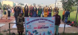 आत्मा राम महाविद्यालय,समस्तीपुर में मनाए जा रहे ’फिट इंडिया सप्ताह ’ के अंतर्गत’ योग का कार्यक्रम’ रखा गया। इस कार्यक्रम के समन्वयक राजनीति विज्ञान विभाग के विभागाध्यक्ष –सह – एनएसएस कार्यक्रम पदाधिकारी डॉ राजीव रौशन ने छात्र-छात्राओं को प्राणायाम, मंत्र ध्यान,ताड़ासन,अनुलोम विलोम, श्वास विधि आदि का अभ्यास कराया।
