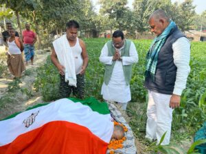 जे टी न्यूज़, समस्तीपुर : वरिष्ठ कांग्रेस नेता तथा लखनपट्टी पंचायत के पूर्व मुखिया स्व० बैजनाथ झा का निधन वारिसनगर प्रखंड अंतर्गत उनके आवास ग्राम लखनपत्ती में आज सुबह सुबह हो गया। उनके निधन से क्षेत्र में शोक की लहर दौड़ गई। उनके निधन से जिला ने कांग्रेस का एक मजबूत स्तंभ खो दिया। जिला कांग्रेस कमिटी के अध्यक्ष श्री मो० अबू तमीम के नेतृत्व में जिला कांग्रेस कमेटी का एक प्रतिनिधि मंडल उनके आवास पर जाकर उनके पार्थिव शरीर को पार्टी को झंडों में लिपटा तथा पुष्प अर्पित किया तथा उनके परिजनों को सांत्वना दी। तथा जिला कांग्रेस कमिटी की तत्वधान में एक शोक सभा का आयोजन भी किया गया जिसकी अध्यक्षता जिला कांग्रेस कमिटी के अध्यक्ष श्री मो० अबू तमीम ने किया। अपने अध्यक्षीय भाषण में श्री तमीम ने उन्हें एक राष्ट्रवादी तथा कुशल समाजसेवी एवं गरीबों के हित के लिए समर्पित राज नेता की संज्ञा दी और बताया कि उनके निधन से पार्टी को जो अपूरणीय क्षति हुई है उसकी भरपाई निकट भविष्य में संभव नहीं है। इस अवसर पर अन्य लोगों के अलावा बिहार प्रदेश कांग्रेस कमिटी के जिला कांग्रेस कमिटी के उपाध्यक्ष देवेन्द्र नारायण झा, युवा कांग्रेस के राष्ट्रीय संयोजक अबू तनवीर, महासचिव शशि भूषण राय, मुकेश कुमार चौधरी, कामेश्वर पासवान, नौखेज आलम, मो० मोहिउद्दीन आदि लोगों ने भी उन्हें श्रद्धांजलि अर्पित किया।