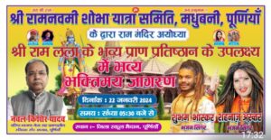 जे टी न्यूज, पूर्णियां: श्री रामनवमी शोभा यात्रा समिति, मधुबनी, पूर्णियाँ के द्वारा राम मंदिर अयोध्या में श्री राम लला के भव्य प्राण प्रतिष्ठान के उपलक्ष्य में भव्य भक्तिमय जागरण