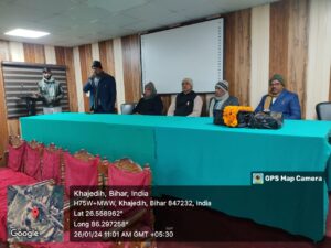 जे टी न्यूज, मधुबनी : लदनियां प्रखंड के खाजेडीह स्थित एसएमजे काॅलेज के सभागार में शुक्रवार को गणतंत्र दिवस पर विदाई सह सम्मान समारोह का आयोजन किया गया। कार्यक्रम में उपस्थित शासीनिकाय के सचिव डाॅ. धनेश्वर प्रसाद सिंह व अध्यक्ष नागेन्द्र नाथ झा ने वनस्पति विभाग से अवकाश प्राप्त हुए चतुर्थ वर्गीय कर्मचारी राजदेव प्रसाद सिंह की विदाई पाग,