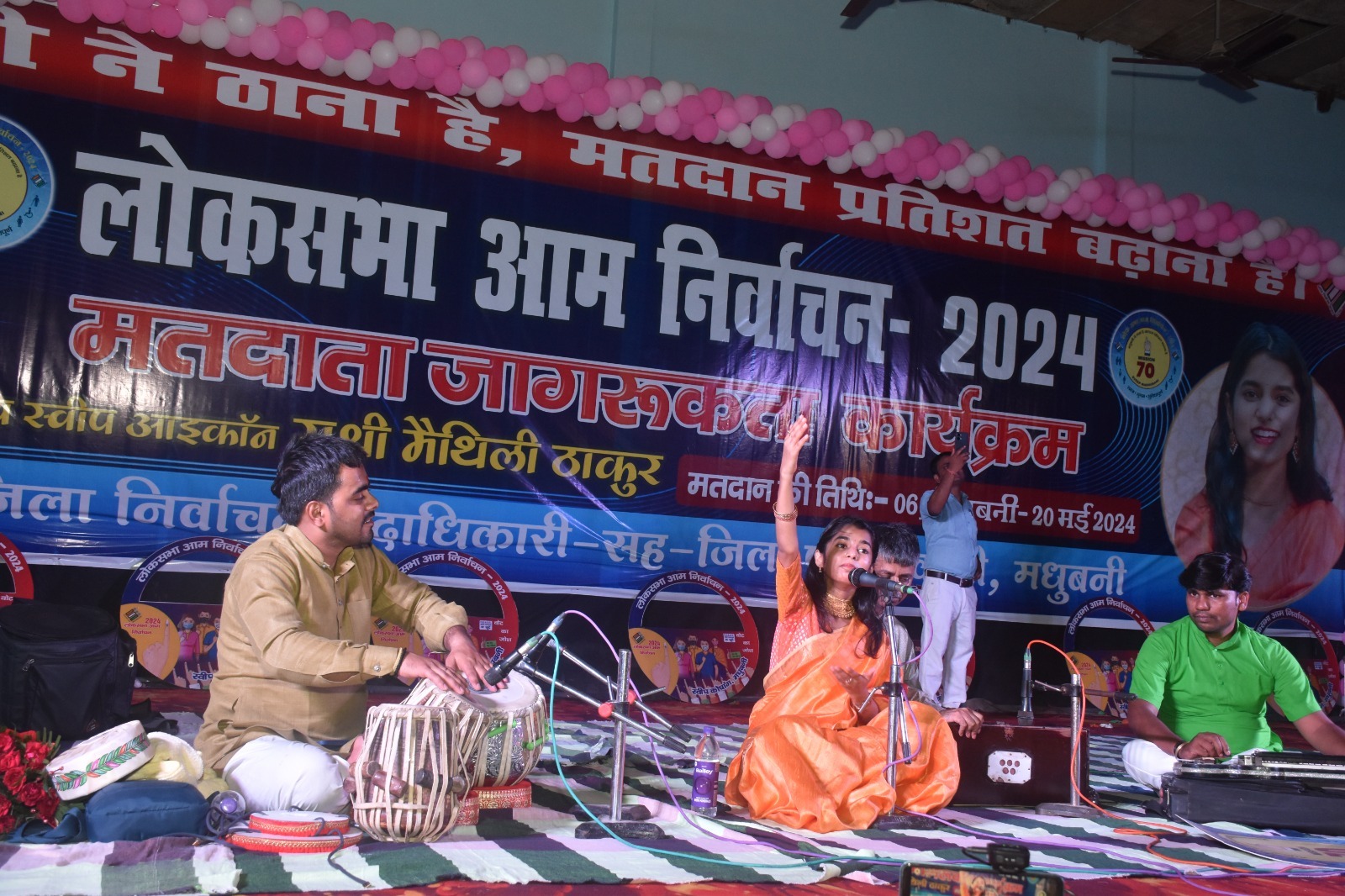 जे टी न्यूज़, मधुबनी( राजू प्रसाद) : अपने अधिकारों का सम्मान करें, चलो सब मिलकर मतदान करें, चलो मतदान करें’ गीतों के साथ चुनाव आयोग की स्टेट आईकॉन मैथिली ठाकुर ने मधुबनी नगर भवन में उपस्थित सैकड़ों मतदाताओं को मतदान के प्रति प्रेरित किया। जिला प्रशासन द्वारा आयोजित मतदाता जागरूकता संगीत कार्यक्रम एवं अपील के आयोजन में लोकसभा आम निर्वाचन 2024 के अंतर्गत बिहार राज्य स्वीप आईकॉन लोक गायिका मैथिली ठाकुर मधुबनी के टाउन हॉल पहुंची थी। आपको बता दें कि पांचवे चरण मे आगामी 20मई को मधुबनी संसदीय क्षेत्र में मतदान होना है।मतदान प्रतिशत को बढ़ाने के उद्देश्य से मैथिली ठाकुर का कार्यक्रम आयोजित किया गया था। इस दौरान मैथिली ठाकुर द्बारा लोगों से अपने घर से निकल कर मतदान के दिन अपना वोट देने की अपील की गई। इस दौरान मैथिली ठाकुर ने लोगों की फरमाइश पर कई गीत प्रस्तुत कर लोगों की खूब तालियां बटोरी। उन्होंने अपनी गीतों के माध्यम से ‘चलो मतदान करें, अपने अधिकारों का सम्मान करें’ गीत के अलावा देशभक्ति ‘गीत दिल दिया है जां भी देंगे, ऐ वतन तेरे लिए’, ‘कोयल बिन बगिया न सोहे राजा’ ’जहां डाल डाल पर चिड़िया करती हैं बसेरा, यह भारत देश है मेरा’ सहित कई अनेक गीतों की प्रस्तुति कर समां बांधा एवं लोगों को झूमने पर मजबूर कर दिया। इस मौके पर जिला निर्वाचन पदाधिकारी सह डीएम अरविंद क़ुमार वर्मा ने कहा तमाम मतदाता जाति धर्म का भेदभाव भूलकर और बगैर किसी प्रलोभन के अपना वोट अवश्य करेंगे और जिला प्रशासन द्बारा निर्धारित लक्ष्य मिशन 70को सफल बनानें के लिए अपना योगदान अवश्य देंगें।