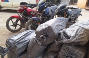 पांच बाइक पर लदे 15 बोरा शराब जब्त।