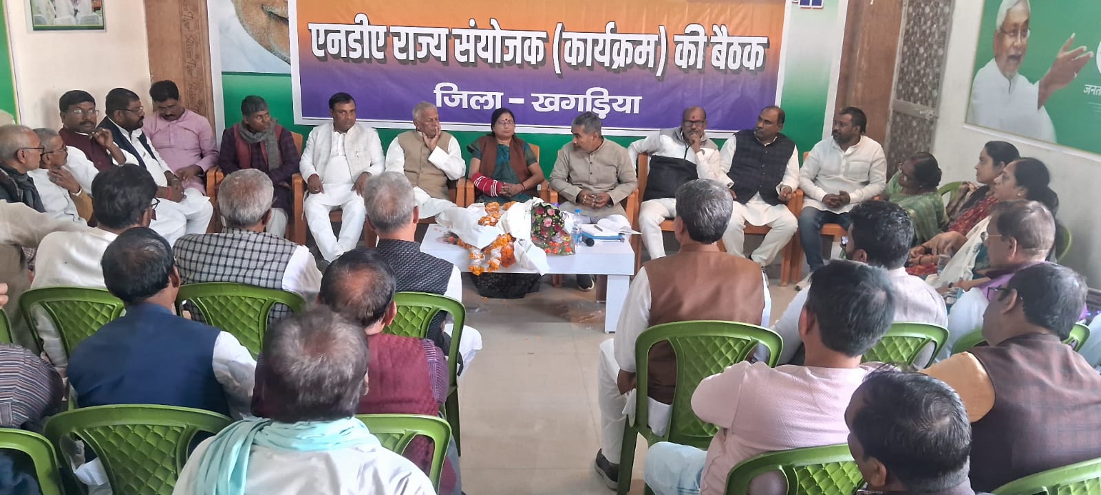 बैठक की अध्यक्षता जदयू जिला अध्यक्ष बबलू कुमार मंडल कर रहे थे। जबकि बैठक में बेलदौर विधायक पन्नालाल सिंह पटेल,सदर की पूर्व विधायक पूनम देवी यादव,जदयू के मुंगेर मंडलीय प्रभारी संतोष कुशवाहा, जदयू प्रदेश महासचिव सुनील कुमार, भाजपा जिला अध्यक्ष शत्रुघ्न भगत, लोजपा रामविलास जिला अध्यक्ष शिवराज यादव, रालोमों के जिला अध्यक्ष कृष्ण कुमार सिंह, जदयू नेता चंदन कश्यप, जदयू उपाध्यक्ष राजकुमार फोगला, लोजपा रामविलास के प्रदेश महासचिव रतन पासवान,जदयू प्रवक्ता आचार्य राकेश पासवान शास्त्री सुल्तानगंज विधानसभा प्रभारी पंकज कुमार पटेल, जदयू जिला उपाध्यक्ष उमेश सिंह पटेल, जदयू नेत्री अनुराधा कुमारी कुशवाहा, सुनील कुमार मेहता,अनील जयसवाल, पूर्व मुख्यमंत्री सतीश प्रसाद के पुत्र सुनील कुमार, उपाध्यक्ष सुबोध यादव, कोषाध्यक्ष संदीप केडिया, नीलम वर्मा, जदयू के जिला महासचिव राजीव रंजन, भाजपा की वंदना कुमारी, नंदू साह, राजेश सिंह,ईं0 धर्मेंद्र कुमार, डॉ इन्दू भूषण कुशवाहा, रालोमों के प्रदेश महासचिव कैलाश वर्मा, हर्षवर्धन कुशवाहा, फिरदौस आलम, मानसी प्रखंड जदयू अध्यक्ष राजनीति प्रसाद सिंह, आजाद पासवान,डॉक्टर रवि कुमार एवं राजीव कुमार ठाकुर सहित दर्जनों की संख्या में एनडीए घटक दल के प्रमुख नेतागण मौजूद थे।