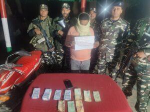 जाली भारतीय मुद्रा: ₹13,800/- (₹100 के कुल 138 नोट)जाली नेपाली मुद्रा: ₹6,500/- (₹500 के कुल 13 नोट)मोटरसाइकिल: बजाज प्लेटिना (रजिस्ट्रेशन नंबर – BR-32 S 3105)मोबाइल फोन: रेडमी 10T 5G (सिम: Jio – 7061429599, Airtel – 7368840710)अन्य सामान:चांदी जैसी दिखने वाली दो अंगूठियां कैसियो ब्रांड की कलाई घड़ी भारतीय मुद्रा ₹770/-गिरफ्तार तस्कर का नाम: मोहम्मद ताहिर (56 वर्ष) थाना/डाकघर – जयनगर, जिला – मधुबनी, बिहार गिरफ्तार तस्कर और जब्त किए गए सामान को थाना बसोपट्टी को सौंप दिया गया है,जहां आगे की कानूनी कार्रवाई जारी है।सशस्त्र सीमा बल के कार्यवाहक कमांडेंट विवेक ओझा का संदेश:यह कार्रवाई तस्करी व अवैध गतिविधियों के खिलाफ सशस्त्र सीमा बल की सतर्कता और प्रतिबद्धता को दर्शाती है। जाली मुद्रा की तस्करी देश की अर्थव्यवस्था व सुरक्षा के लिए एक गंभीर खतरा है। हमारी टीम ने इस ऑपरेशन में असाधारण मुस्तैदी का परिचय दिया है। मैं सभी जवानों को इस सफलता के लिए बधाई देता हूँ और उम्मीद करता हूँ कि वे इसी जोश और समर्पण के साथ भविष्य में भी सीमाओं की सुरक्षा सुनिश्चित करेंगे।
