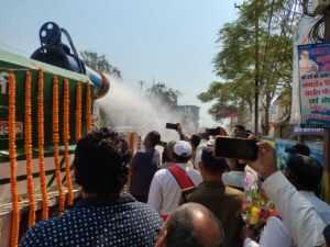 जे टी न्यूज( प्रो अरुण कुमार): मधुबनी शहर में वायु प्रदूषण नियंत्रण हेतु जिलाधिकारी ने नगर निगम मधुबनी की नई स्प्रिंकलर मशीन युक्त वाहन को हरी झंडी दिखाकर किया रवाना | मधुबनी शहर में वायु प्रदूषण को नियंत्रित करने और पर्यावरण को स्वच्छ एवं स्वस्थ बनाने के उद्देश्य से जिलाधिकारी अरविन्द कुमार वर्मा ने समाहरणालय से नगर निगम मधुबनी की स्प्रिंकलर मशीन युक्त वाहन को हरी झंडी दिखाकर रवाना किया | इस अवसर पर जिलाधिकारी ने नगर निगम मधुबनी को धन्यवाद देते हुए कहा कि यह पहल शहर में वायु गुणवत्ता सुधारने और सड़कों पर जमी धूल को नियंत्रित करने के लिए महत्वपूर्ण कदम है। इस स्प्रिंकलर मशीन युक्त वाहन से रोड पर नियमित रूप से पानी का छिड़काव किया जाएगा, जिससे सड़क किनारे जमी धूल नहीं उड़ेगी और वायु प्रदूषण में कमी आएगी। उन्होंने कहा कि इस पहल से एयर क्वालिटी इंडेक्स (AQI) में सुधार होगा और नागरिकों को स्वच्छ वातावरण मिलेगा। जिलाधिकारी ने आगे बताया कि शहरी क्षेत्रों में बढ़ते वायु प्रदूषण को नियंत्रित करने के लिए यह एक प्रभावी प्रयास है। इससे अस्थमा, एलर्जी और अन्य सांस संबंधी बीमारियों से राहत मिलेगी। उन्होंने आम जनता से भी अनुरोध किया कि स्वच्छता और पर्यावरण संरक्षण में अपना योगदान अवश्य दें।उन्होंने कहा कि व्यापक जनसहभागिता से ही स्वच्छता अभियान को सफल बना सकते है।मेयर अरुण राय ने कहा कि इससे मधुबनी शहर प्रदूषण मुक्त होगा। उन्होंने कहा कि नगर निगम मधुबनी नागरिक सुविधाओं को सर्वोच्च प्राथमिकता में रखकर कार्य कर रहा है। इस अवसर पर मेयर नगर निगम मधुबनी अरुण राय, नगर आयुक्त अनिल चौधरी सहित कई अधिकारी,जनप्रतिनिधि एवं आम नागरिक उपस्थित रहे।