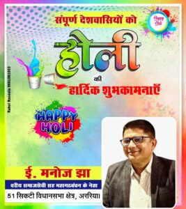 महागठबंधन के प्रबल दावेदार ई. मनोज झा ने सिकटी विधानसभा क्षेत्रवासियों को दी होली की शुभकामनाएं