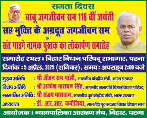 जे टी न्यूज, पटना: 5 अप्रैल 2025 को बाबू जगजीवन राम का 118वां जन्मदिन समता दिवस के रूप में बिहार विधान परिषद सभागार पटना में धूमधाम से मनाया गया। इस अवसर पर इंजीनियर राजेन्द्र प्रसाद की पुस्तक “मुक्ति के अग्रदूत जगजीवन राम” का और महान संत गाडगे के जीवन पर अंग्रेजी संस्करण “संत गाडगे ए लिजेन्ड्री पर्सनालिटी आफ इंडिया ” नामक पुस्तक का लोकार्पण श्री जीतन राम मांझी माननीय केंद्रीय मंत्री भारत सरकार द्वारा किया गया।