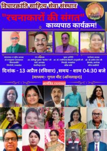 जे टी न्यूज, मध्यप्रदेश: विचारक्रांति साहित्य सेवा संस्थान, सिंगरौली, मध्यप्रदेश (भारत सरकार द्वारा पंजीकृत संस्था) के संस्थापक व राष्ट्रीय अध्यक्ष डॉ० राजकुमार जायसवाल विचारक्रांति ने 13 अप्रैल को शाम 4:30 बजे से 6 बजे तक ” रचनाकारों की संगत ” शानदार काव्य पाठ का आयोजन किया, जिसमें अपने मुक्तकों के माध्यम से बेहतरीन मंच का संचालन रांची (झारखंड) के सेवानिवृति डीएसपी कामेश्वर कुमार कामेश जी ने किया। काव्य पाठ का विधिवत् शुभारंभ अयोध्या, उत्तरप्रदेश से दिव्यांजली वर्मा जी के सरस्वती वंदना के साथ हुआ। सरस्वती वंदना के पश्चात पटल के संस्थापक राजकुमार जायसवाल विचारक्रांति ने कार्यक्रम के लिए सभी रचनाकारों को शुभाशीष देते हुए कार्यकम अध्यक्ष डॉ० अर्चना श्रेया जी के अनुमति से काव्य पाठ का सिलसिला शुरू हुआ। जिसमें सर्वप्रथम कार्यक्रम के मुख्य अतिथि डॉ० रामनिवास तिवारी आशुकवि जी,निवाड़ी, मध्यप्रदेश ने उद्बोधन देते हुए कहा कि विचारक्रांति साहित्य सेवा संस्थान शुरुआत से साहित्य की दिशा बेहतरीन कार्य कर देश – विदेश में परचम फहरा रहा है।
