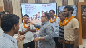 यूआर कॉलेज में कार्यरत दिहाड़ी मजदूरों को मजदूर दिवस पर माला पहनाकर व मिठाई खिलाकर किया गया सम्मानित