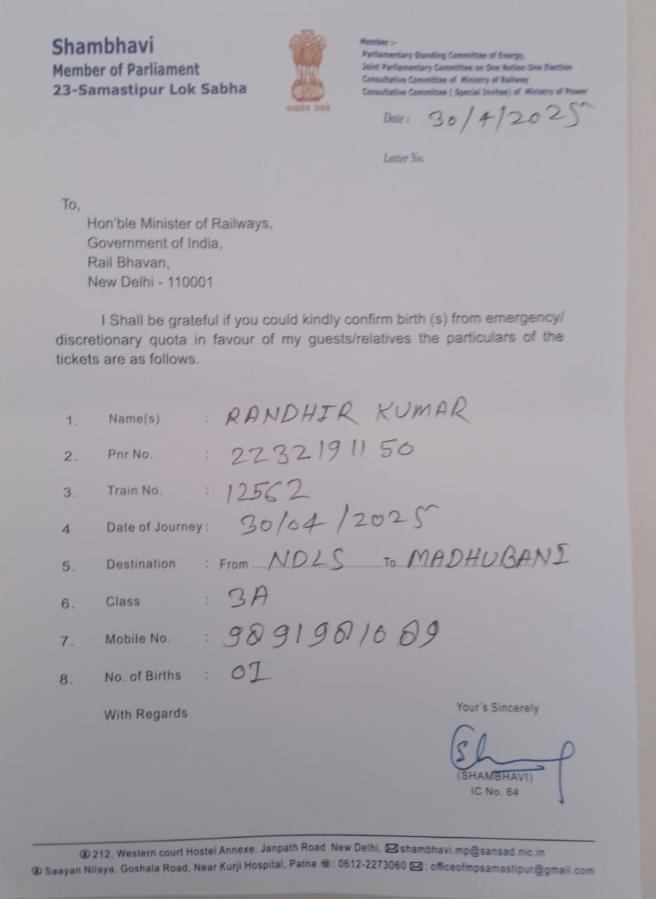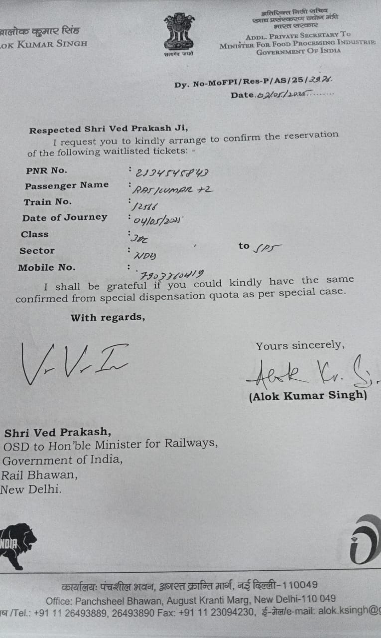 इस बाबत मिली जानकारी के मुताबिक सांसद या कैबिनेट मंत्री स्तर के मंत्रियों द्वारा अपने अतिथियों या क्षेत्र की जरूरतमंद जनता के लिए आपात कोटे से सीट आरक्षित करने हेतु सिफारिश भेजे जाते हैं। मगर मौजूदा सरकार में सांसद तो छोड़िये मंत्री के पत्र को भी कोई महत्व नहीं दिया जाता है। वहीं हमारे सुत्रों की मानें तो रेल भवन में बैठे अधिकारी स्टेशनों के दलालों के माध्यम से या आईआरसीटीसी के काउंटर पर बैठे दलालों के माध्यम से 500 से 1000 रुपए में टिकट कंफर्म करने के गोरखधंधा में लिप्त हैं। इस मामला का खुलासा तब हुआ जब समस्तीपुर से प्रकाशित झंझट टाइम्स के संपादक आरके राय ने दिल्ली एम्स से छुट्टी पाने के बाद रामविलास पासवान के पुत्र मोदी सरकार में कैबिनेट मंत्री चिराग पासवान के पत्र के आधार पर आरक्षित सीट की मांग की। मगर लोजपा नेता के( EQ) पत्र की अनदेखी कर दी गयी। इतना ही नहीं राज्य मंत्री रामनाथ ठाकुर, उपेन्द्र कुशवाहा का सिफारिश पत्र भी लगा कर कोटे से आरक्षित सीट की मांग नई दिल्ली से समस्तीपुर के लिए बिहार संपर्क और वैशाली में मांगा था। मगर किसी पत्र का कोई असर नहीं हुआ।