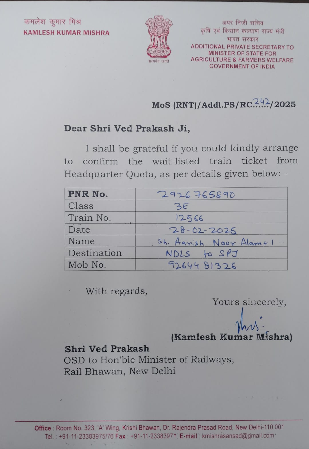 नो रूम होने पर भी हजार रूपए में सीट कन्फर्म करा देते हैं। हालांकि ये एक जांच का विषय है। आखिर किस स्थिति में मोदी मंत्रिमंडल के मंत्री का टिकट रेल भवन द्वारा कंफर्म नहॉ किया गया ।