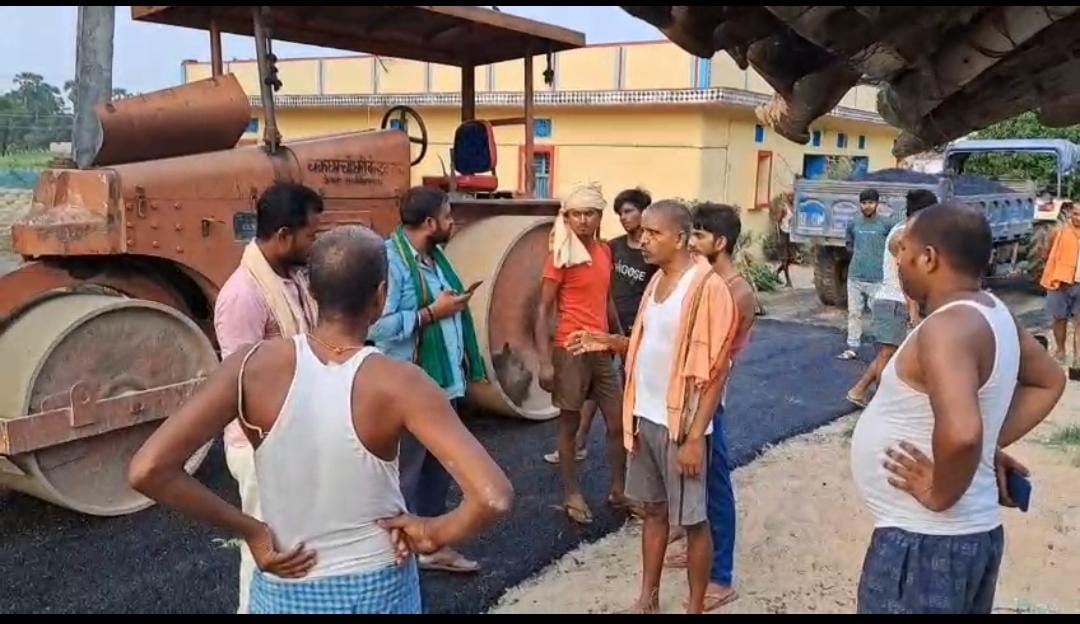 घटिया सड़क निर्माण पर ग्रामीणों ने रोका काम