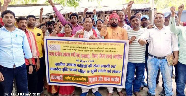 राज्य ग्रामीण आवास कर्मी संघ (सगासा) बिहार के बैनर तले जिले के सभी आवास कर्मियों की बेमियादी हड़ताल मंगलवार को दूसरे दिन भी जारी रही। कर्मियों ने नारेबाज़ी कर सरकार के खिलाफ रोष जताया और चेतावनी दी कि जब तक सेवा-स्थायिकरण, पुरानी पेंशन, अनुकंपा, मानदेय पुनरीक्षण और सेवा समाप्ति व एफआईआर की कार्यवाही रद्द नहीं होती, तब तक कार्य बहिष्कार जारी रहेगा।संघ के जिला अध्यक्ष आचार्य राकेश पासवान शास्त्री ने आरोप लगाया कि आवास सहायकों को बिना स्पष्टीकरण चयन-मुक्त कर एफआईआर दर्ज करना न सिर्फ पक्षपातपूर्ण है, बल्कि मानवाधिकार आयोग व अशोक चौधरी कमेटी के निर्देशों की अवहेलना भी है। उन्होंने कहा, “विकास आयुक्त की अध्यक्षता वाली समिति दो साल से संविदा कर्मियों के पारिश्रमिक निर्धारण पर चुप्पी साधे बैठी है। सरकार की निष्क्रियता से हमारी आजीविका और भविष्य दोनों अधर में हैं।” जिला संयोजक संतोष आर्या, उपाध्यक्ष (पर्यवेक्षक) अभिषेक कुमार, कोषाध्यक्ष राजेश कुमार, आकाश कुमार, चंदन कुमार एवं जिला सचिव मधुसूदन कुमार समेत पदाधिकारियों ने कहा कि कई प्रखंडों में आवास कर्मियों के खिलाफ बिना निष्पक्ष जांच कार्रवाई हो रही है। “यदि हमारी जायज़ मांगें नहीं मानी गईं तो बाधित योजनाओं की ज़िम्मेदारी सरकार पर होगी,” नेताओं ने दोहराया।इन कर्मियों ने कहा कि जबतक हमारी मांग पुरा नही होता है तब तक हड़ताल जारी रहेगा। हड़ताल में शरीक प्रमुख कर्मी :- पर्यवेक्षक धीरज कुमार, लेखा सहायक रजनीश मिश्रा, कुमारी कोमल, रुबी कुमारी अकेली, असद उल्लाह शाद, पिन्टू ठाकुर, बॉबी कुमारी, पिंकी कुमारी, रितु गुप्ता, निधि कुमारी, राजीव कुमार यादव, इंजीनियर रंजीत कुमार, प्रियतम कुमार, सुनील कुमार पासवान, गणित कुमार, राकेश कुमार कुशवाहा, पिंटू कुमार, देव कुमार, धर्मेंद्र कुमार यादव, सुमन यादव, गौतम कुमार, उदय पासवान, अभय कुमार, डॉ प्रवीण कुमार, अनिकेत कुमार, अशोक मरांडी, चुनचुन सिंह, सतीश कुमार, राजीव कुमार, आशीष, सज्जन, राकेश आनंद, ताहिर हसन, ललन कुमार निराला, राजू कुमार, सुधांशु यादव, राजीव रंजन, दिलीप पोद्दार, नीतेश कुमार दास, निलेश कुमार, सुरेंद्र कुमार, मनोज कुमार, विकास कुमार, सुमित सिन्हा, नवीन कुमार, नवेश कुमार, कुमार राम, स्मिता कुमारी, इन्दू रानी, ललन कुमार, बमशंकर झा, राजीव झा, निर्मल कुमार, सुरेश यादव, आबिद हुसैन और नीलकमल सहित सभी आवास कर्मियों ने एकजुटता प्रदर्शित करते हुए “सरकार जवाब दो—न्याय दो” जैसे गगनभेदी नारे लगाए।