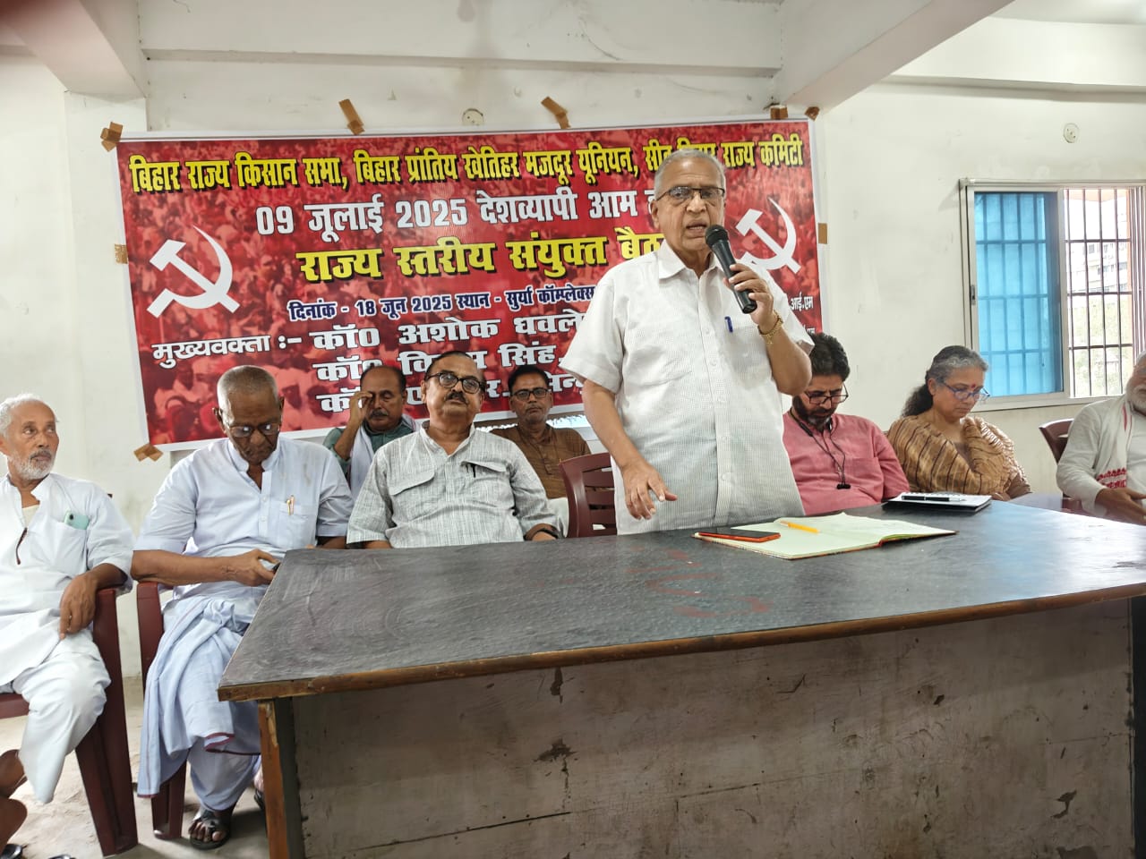 जे टी न्यूज, पटना : आज सूर्या भवन जमाल रोड पटना में बिहार राज्य किसान सभा ,सीटू तथा बिहार प्रांतीय खेतिहर मजदूर यूनियन की संयुक्त बैठक को संबोधित करते हुए अखिल भारतीय किसान सभा के अध्यक्ष का. अशोक ढवले ने कहा कि पिछले 11 साल में लगातार जनता ,मजदूर वर्ग,किसान समुदाय तथा खेत मजदूरों पर हमले हुए हैं।कोरोना के समय सितंबर 2020 में 7 कानून लाए।जिसमें चार लेबर कोड,किसानों के खिलाफ तीन कानून पास कराया।जो कारपोरेट, अडानी,अंबानी जैसे लोगों के हाथों में देश की जमीन,मजदूरों के अधिकार को समाप्त करने के लिए 7 कानून लाए गए।यह इसलिए हुआ कि कोरोना में लोग डरे हुए हैं।ये विरोध नहीं कर पाएंगे।इसे मोदी ने आपदा में अवसर बताया था।