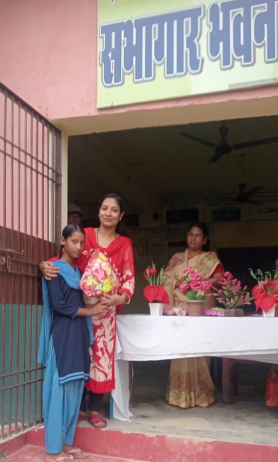 मध्यविद्यालय महथा में गुलदस्ते से हो रहा छात्रों का स्वागत