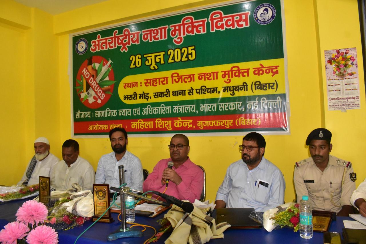 जे टी न्यूज, मधुबनी: सामाजिक न्याय एवं अधिकारिता मंत्रालय भारत सरकार एवं सामाजिक सुरक्षा निदेशालय बिहार पटना के निदेशानुसार अंतरराष्ट्रीय मादक पदार्थ दुरुपयोग निवारण दिवस के अवसर पर मधुबनी जिला अंतर्गत नशा मुक्ति कार्यक्रम का आयोजन किया गया। इसके तहत सहारा नशा मुक्ति केंद्र, मधुबनी पर नशा न करने के प्रति लोगों को जागरूक करने हेतु कार्यक्रम सह कार्यशाला का आयोजन किया गया।