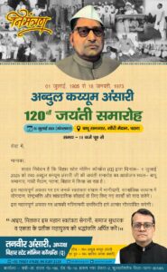 पटना (आर के राय) : महान स्वतंत्रता सेनानी , राजनेता , पूर्व मंत्री, बिहार सरकार एवं प्रखर समाज सेवी, बाबा-ए-क़ौम स्व० अब्दुल कय्यूम अंसारी की 120वी जयंती दिनांक 1 जुलाई 2025 मंगलवार को 11 बजे पूर्वाह्न से बापू सभागार, गाँधी मैदान , पटना में बिहार स्टेट मोमिन कांफ्रेंस(क्यू) के तत्वावधान में भव्य रूप से मनाया जा रही है ,