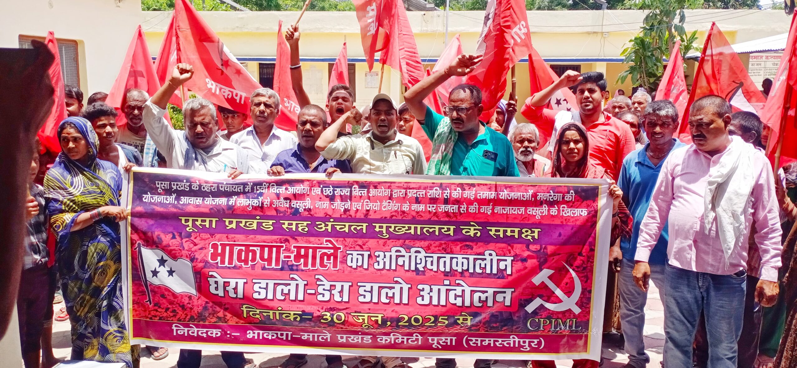जे टी न्यूज, पूसा/समस्तीपुर :प्रखंड के ठहरा पंचायत में 15वीं वित्त आयोग एवं छठे राज्य वित्त आयोग द्वारा प्रदत्त राशि से की गई तमाम योजनाओं की जांच, मनरेगा योजनाओं में लूट-खसोट,भ्रष्टाचार, फर्जी निकासी, फर्जी फोटो अपलोड करने,आवास योजना में लाभुकों से अवैध वसूली,नाम जोड़ने एवं जियो टैगिंग के नाम पर जनता से की गई नाजायज़ वसूली आदि की जांच कर दोषियों पर कार्रवाई करने की मांग को लेकर भाकपा-माले के कार्यकर्ताओं ने बड़ी संख्या में पूसा के मानस मंदिर से जुलूस निकाल विभिन्न मार्ग से होते हुए प्रखंड मुख्यालय पर पहुँचकर आक्रोशपूर्ण प्रदर्शन किया। इसके बाद मनरेगा कार्यालय के सामने सभी कार्यकर्ता अनिश्चितकालीन घेरा डालो-डेरा डालो धरना पर बैठ गए। इसका नेतृत्व भाकपा-माले प्रखंड सचिव अमित कुमार ने किया।