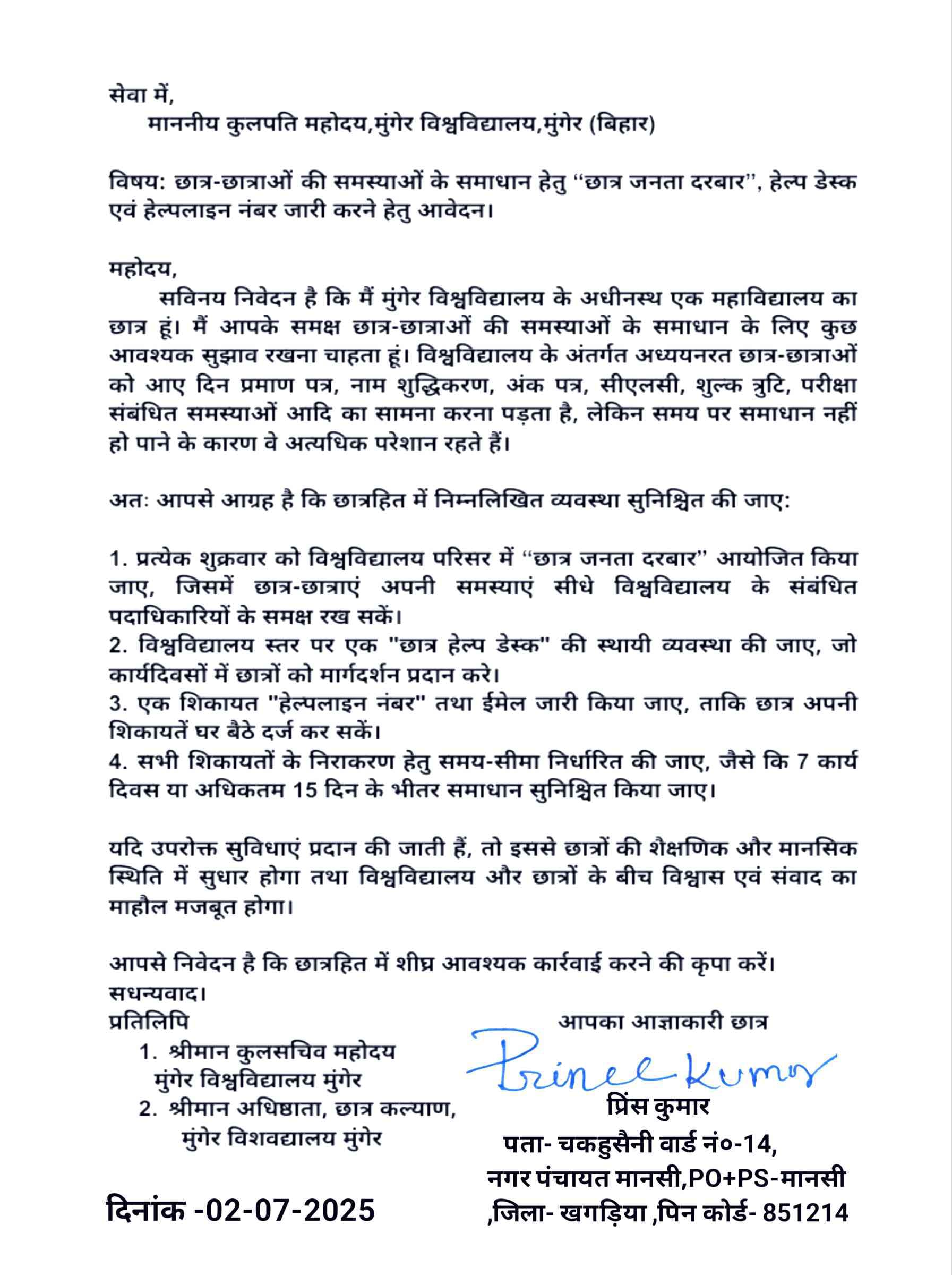 मुंगेर विश्वविद्यालय में अध्ययनरत छात्र नेता प्रिंस कुमार ने कुलपति महोदय को एक मांग पत्र सौंपा, जिसमें उन्होंने छात्रों की विभिन्न समस्याओं के समाधान के लिए “छात्र जनता दरबार”, हेल्प डेस्क तथा हेल्पलाइन नंबर जैसी व्यवस्थाएं लागू करने की मांग की है।