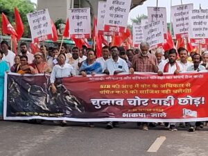 ‘वोट चोर, गद्दी छोड़’ के नारे के साथ आज पटना में भाकपा-माले ने बुद्ध स्मृति पार्क से सतमूर्ति तक विरोध मार्च का आयोजन किया, जिसका नेतृत्व माले महासचिव का. दीपंकर भट्टाचार्य ने किया. सतमूर्ति गोलबंर पर 11 अगस्त 1942 को तिरंगा फहराने के क्रम में शहीद हुए सभी सात छात्रों को श्रद्धांजलि देने के बाद आयोजित सभा को संबोधित करते हुए माले महासचिव ने कहा कि देश में आज़ादी के बाद संविधान, लोकतंत्र और मताधिकार पर सबसे बड़ा हमला हुआ है। हमें जो संविधान मिला था, उसमें हर नागरिक को बराबरी का दर्जा और वोट देने का अधिकार दिया गया था – चाहे वह अमीर हो या ग़रीब, दलित हो या अल्पसंख्यक, महिला हो या मज़दूर। लेकिन आज वो अधिकार छीनने की तैयारी हो रही है।