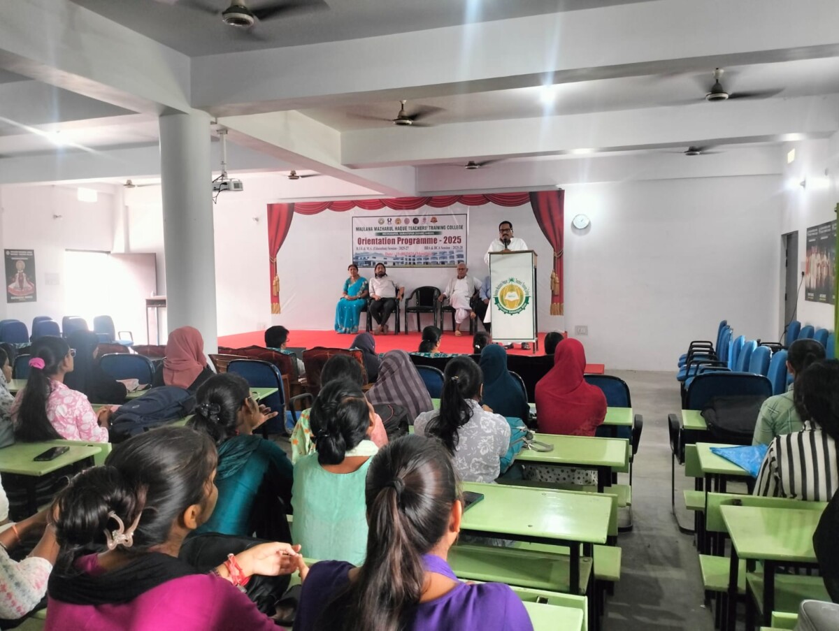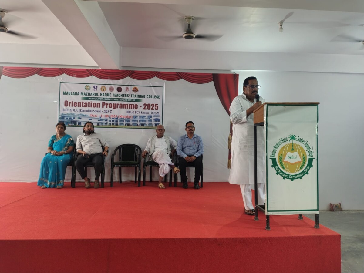 जे टी न्यूज़, समस्तीपुर : मौलाना मजहरुल हक शिक्षक प्रशिक्षण महाविधालय, मथुरापुर, समस्तीपुर में B.Ed. एवं M.A (Education) सत्र 2025–27 तथा BBA एवं BCA सत्र 2025–28 के नवप्रवेशित विद्यार्थियों के लिए आयोजित ओरिएंटेशन कार्यक्रम सफलता पूर्वक संपन्न हो गया। कॉलेज सभागार में आयोजित इस कार्यक्रम का शुभारंभ मुख्य अतिथि महाविधालय के अध्यक्ष श्री अबू तमीम तथा विशिस्ट अतिथि श्री देवेंद्र नारायण झा तथा महाविद्यालय के सचिव मो० अबू सईद ने संयुक्त रूप से दीप प्रज्वलित कर किया I अपने सम्बोधन में श्री तमीम ने विद्यार्थियों को शिक्षा के प्रति समर्पण, अनुशासन और नवाचार की भावना के साथ आगे बढ़ने का संदेश दिया। कार्यक्रम में विभिन्न विभागों के संकाय सदस्यों ने पाठ्यक्रम की रूपरेखा, मूल्यांकन प्रणाली, सह-पाठ्यक्रम गतिविधियों एवं संस्थान की कार्यप्रणाली पर विस्तार से जानकारी दी। अतिथि वक्ताओं ने उच्च शिक्षा में नैतिक मूल्यों, डिजिटल साक्षरता और नेतृत्व विकास पर प्रेरक विचार साझा किए। विद्यार्थियों ने उत्साहपूर्वक भाग लिया और कार्यक्रम के अंत में प्रश्नोत्तर सत्र में सक्रिय सहभागिता दिखाई। कार्यक्रम का संचालन डॉ० अशोक कुमार अकेला, सहायक प्राध्यापक द्वारा किया गया तथा धन्यवाद ज्ञापन डॉ० रंजीता कुमारी कार्यक्रम समन्वयक द्वारा प्रस्तुत किया गया। कॉलेज प्रशासन ने सभी विद्यार्थियों को उनके उज्ज्वल भविष्य की शुभकामनाएं दीं।